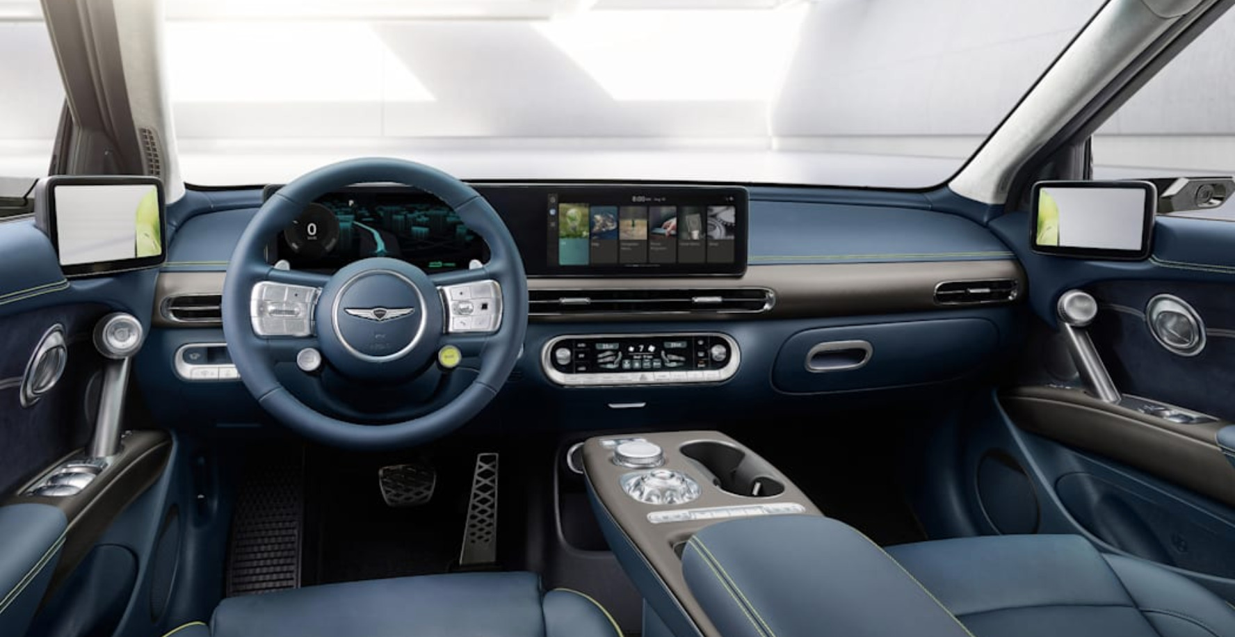 Au-dessus, des phares quadruples enveloppent les coins avant, définissant le rebord du capot, une autre première pour la marque. L’insigne Genesis à l’avant et au centre n’est pas seulement plus mince de près de 80 % que le logo habituel, il est gravé d’un motif guilloché que l’on voit souvent sur les montres de luxe et les bijoux en émail.
