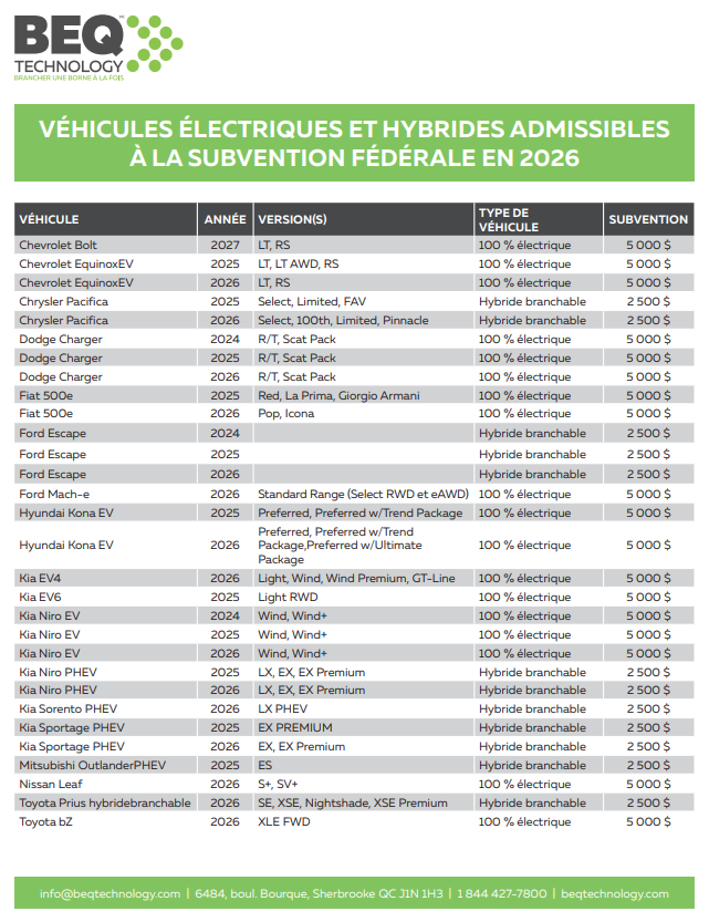 L’objectif principal est simple : réduire le coût d’acquisition des VÉ plus abordables, afin que davantage de Canadiennes et Canadiens puissent passer à l’électrique sans se heurter à des barrières financières. Dans le cadre de ce programme, ce sont les VÉ dits « abordables » qui sont visés et les modèles admissibles à la subvention fédérale sont multiples, vous aurez l’embarras du choix!